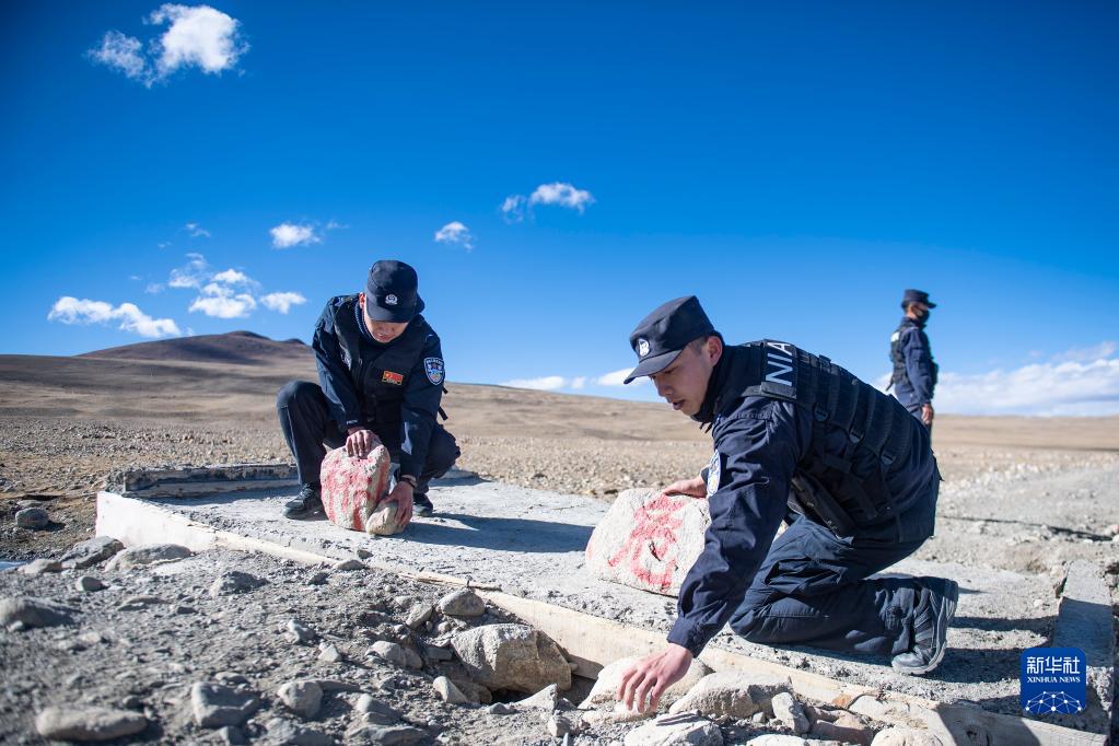 普瑪江塘邊境派出所的移民管理警察們在巡邏時,扶起被大風(fēng)吹倒的就地取材制作的“危橋”警示牌(11月20日攝)。新華社記者 孫瑞博 攝