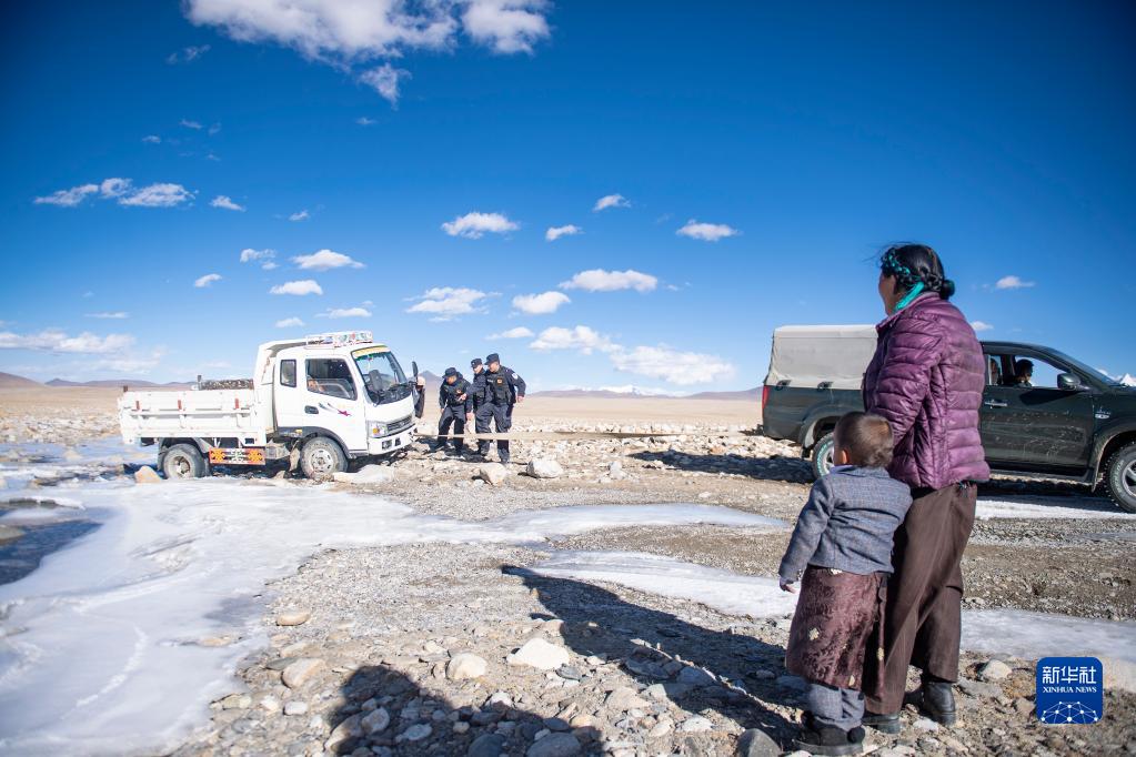 普瑪江塘邊境派出所的移民管理警察幫助牧民旦增多杰的家人離開困在冰河里的小貨車(11月20日攝)。新華社記者 孫瑞博 攝