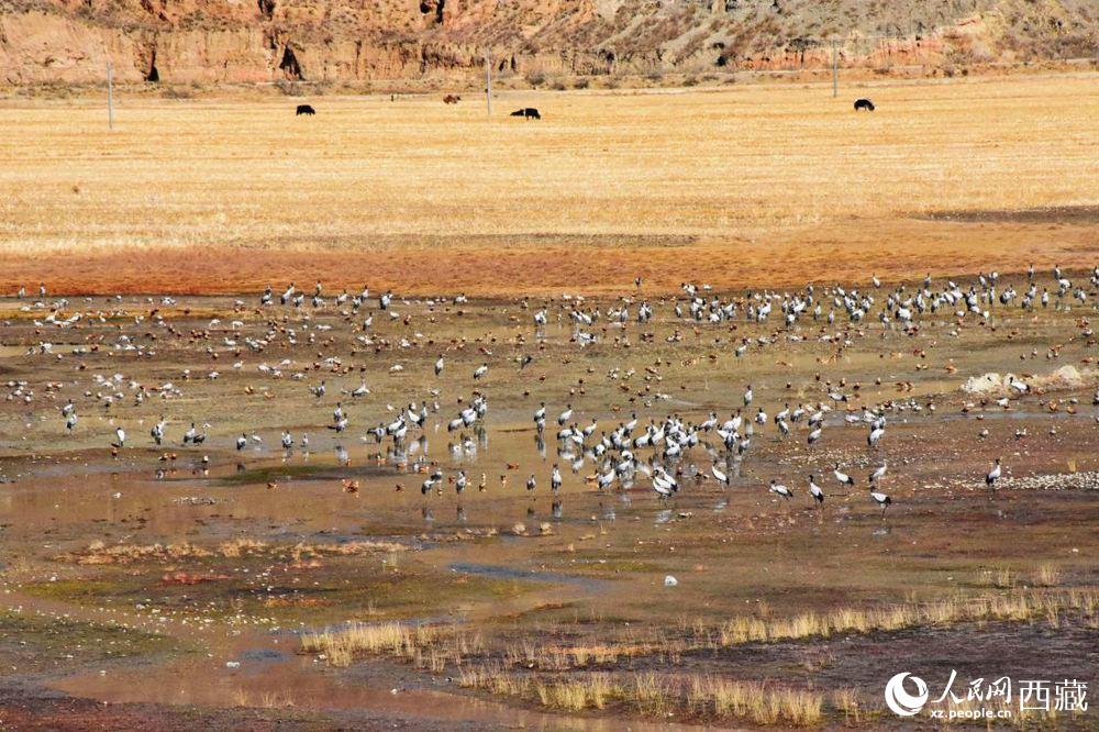 黑頸鶴在收割完的青稞地。人民網(wǎng) 李海霞 攝