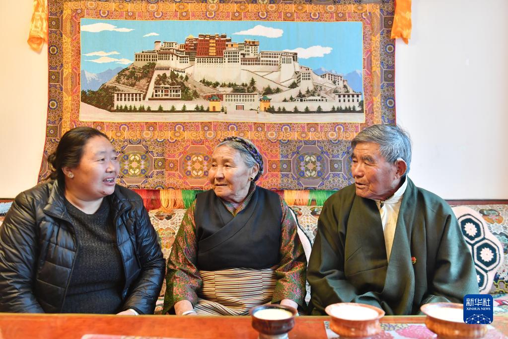 土丹堅參老人(右)和老伴(中)、女兒在一起聊天(5月11日攝)。新華社記者 孫瑞博 攝