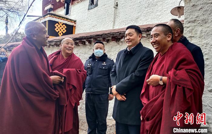 1月28日,調(diào)研組一行先后來到哲蚌寺、城關(guān)區(qū)雪堆白文教集團、城關(guān)區(qū)河壩林社區(qū)、色拉寺,看望慰問基層統(tǒng)戰(zhàn)干部、寺管會干部、駐寺派出所干警、消防和部隊官兵、寺廟僧人以及民營經(jīng)濟人士等,并以現(xiàn)場察看、聽取匯報、座談交流的形式,詳細了解寺廟管理、僧尼教育、維護穩(wěn)定、消防安全和民族團結(jié)進步創(chuàng)建等方面的工作。