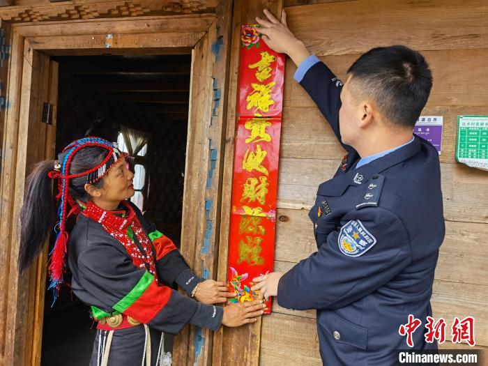 圖為林芝達(dá)木邊境派出所民警幫轄區(qū)民眾貼春聯(lián)?!⊥鯘?攝