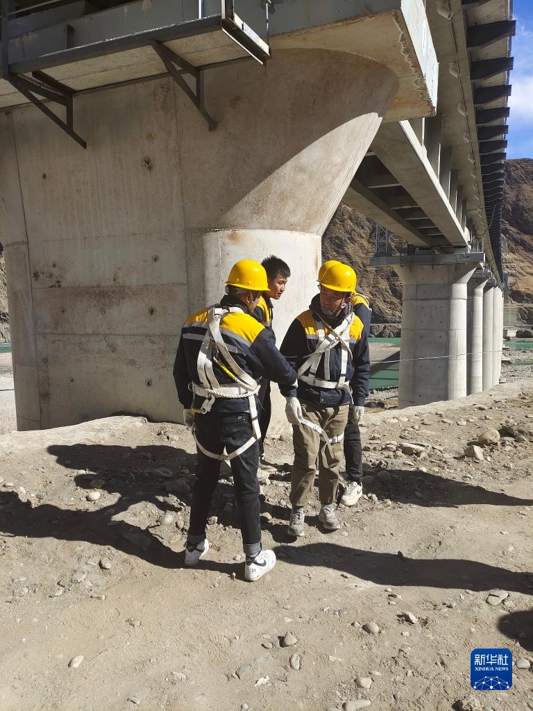 冷達2號雅魯藏布江特大橋橫跨雅魯藏布江。“90后”橋隧工趙浩澤穿著亮黃色安全馬甲,系好安全帶,開始檢查抗震樁、支座和支撐墊石的情況。
