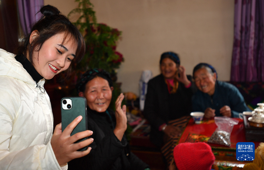 云南省楚雄彝族自治州的軍屬普曉虹寒假期間跟隨官兵到三位老阿媽家里走訪,她在和云南老家父母視頻通話時(shí)說:“爸媽,我在西藏有了三個(gè)阿媽!”(1月26日攝)。新華社記者 覺果 攝