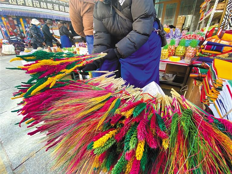 堆龍德慶區(qū)桑木社區(qū)五組,家家戶戶都會制作“羅薩美朵”并在藏歷新年前售賣?!啊_薩美朵’是一種經(jīng)過染色、手工制作、色彩各異的麥穗狀花朵,每年春季播種,金秋時(shí)節(jié)收獲,懸掛風(fēng)干,完好保存。到了藏歷11月,采購染色的顏料和捆扎用的毛線繩,把早已收割晾曬好的‘羅薩美朵’拿出來,為其染色、捆扎,然后拿到市區(qū)進(jìn)行銷售?!鄙D旧鐓^(qū)五組居民達(dá)珍告訴記者。
