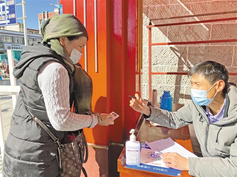 八廓商城市場部部長卓嘎介紹說:“為廣大市民提供一個安全、祥和的購物環(huán)境,我們在商場設(shè)有5個進出口,每個進出口都需掃行程碼、測量體溫后才可進入。因為有些老人沒有智能手機,無法掃健康瑪,我們會登記姓名、身份證號、聯(lián)系方式。并且在增加的攤位旁增設(shè)消防器材,不定時巡邏?!?/p>