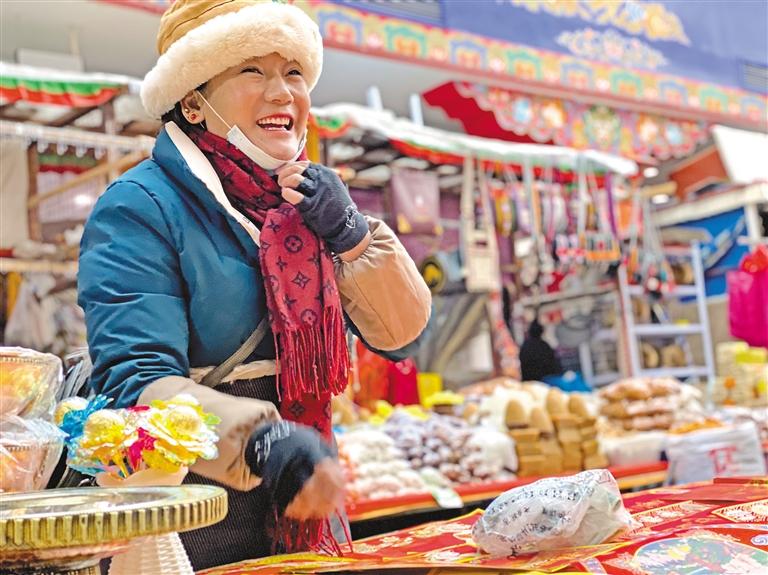 走出八廓商城,熙熙攘攘的人群中,大家眉眼帶笑,手上都拎著各式年貨,喜慶歡欣的氛圍充溢在大街小巷。藏歷新年的腳步越來越近了,古城年味日益濃。