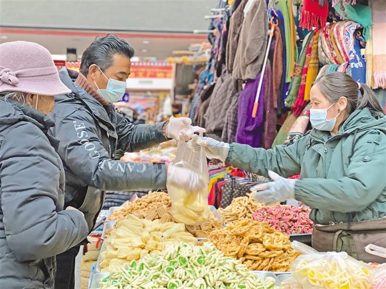 漫步八廓商城,從一樓到三樓,攤位整齊有序。風干的牛羊肉、色彩斑斕的“卡賽”醉人的青稞酒……從節(jié)日用品、服裝飾品到干果零食,各式各樣的年貨琳瑯滿目。