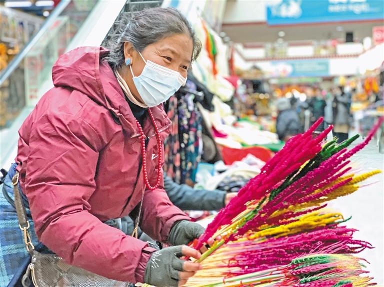 今年是次卓瑪在八廓商城年貨攤位擺攤的第8年,隨著老顧客的不斷增多,她每年對自己制作“羅薩美朵”的要求也越來越高?!胞溗氲娘枬M度和染色均勻度都需要精心選、細心染,雖然每把只賣5元,但一年也就售賣一次。”次卓瑪質(zhì)樸地說。