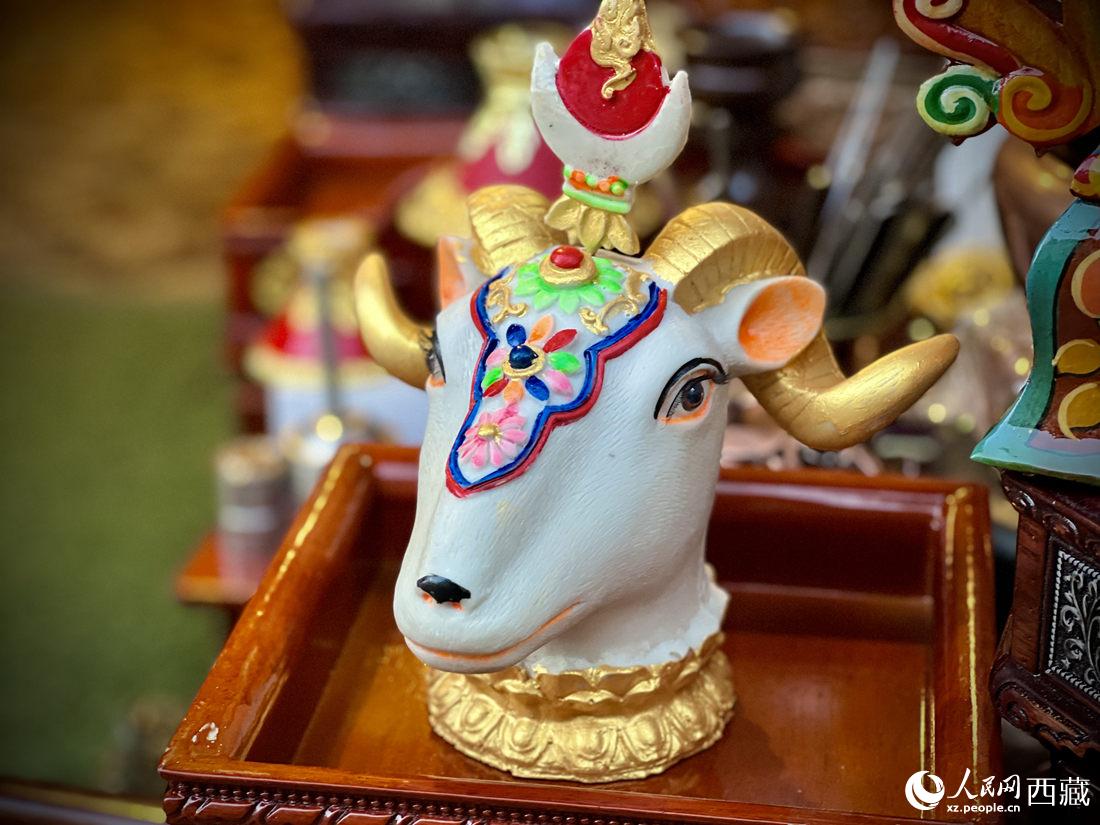 年貨市場上售賣的“隆果”。(在藏語中,“隆果” 是羊頭的意思,也是新年的諧音。它一般擺放在所有供品的中央,因為人們認(rèn)為“羊”是吉祥之物,同時也祈盼五谷豐登,六畜興旺。)人民網(wǎng) 次仁羅布攝