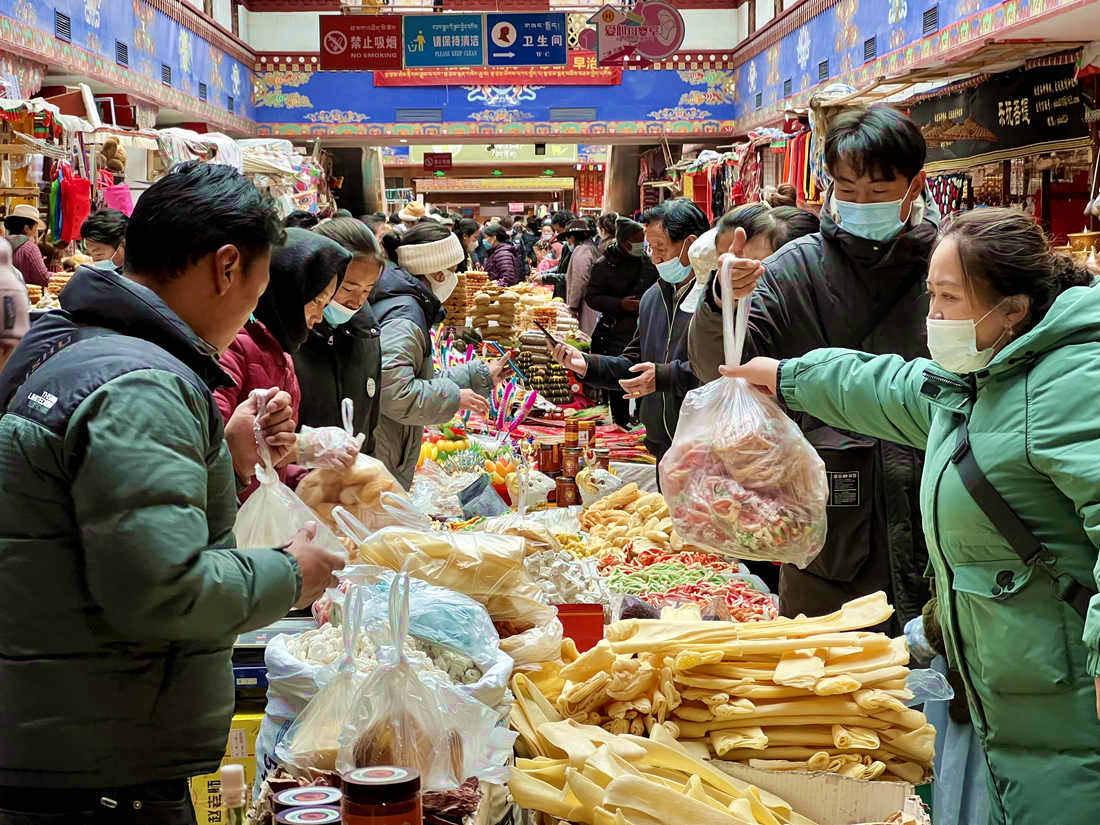 沖賽康市場、八廓商城、拉薩市區(qū)各大小超市熱鬧非凡、人頭攢動,處處都是為了采購藏歷新年年貨樂此不疲的居民群眾,耳邊盡是熟悉的吆喝聲,到處都是歡樂與喜慶。