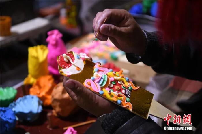 2022年2月14日,酥油花手工藝人在拉薩八廓古城現(xiàn)場制作。藏歷新年臨近,酥油花在年貨市場熱銷。酥油花在藏語中稱為“孜扎”,是古時(shí)藏傳佛教信眾因冬季沒有鮮花供佛而發(fā)明的替代品,如今已是藏族老百姓家庭中必備的年貨之一。中新社記者 貢嘎來松 攝