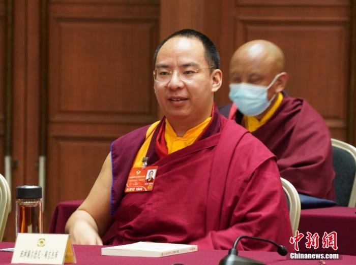 圖為3月9日,班禪額爾德尼·確吉杰布參加全國(guó)政協(xié)十三屆五次會(huì)議宗教界小組會(huì)議。中新社記者 李晗雪 攝