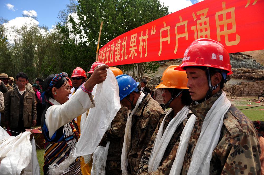 西藏日喀則市江孜縣扎果村戶戶通電工程竣工投運,農(nóng)牧民群眾向工程建設者們獻上哈達。圖片由國網(wǎng)西藏電力提供