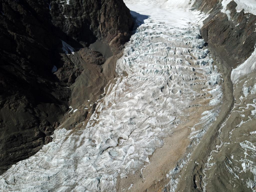 2022年3月27日拍攝的窮母崗日峰腳下的冰川。(無(wú)人機(jī)照片,新華社記者 姜帆 攝)