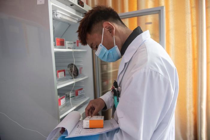 米瑪次仁在林芝市巴宜區(qū)更章鄉(xiāng)衛(wèi)生院清點(diǎn)疫苗庫存情況(2021年12月24日攝)。新華社記者 孫瑞博 攝