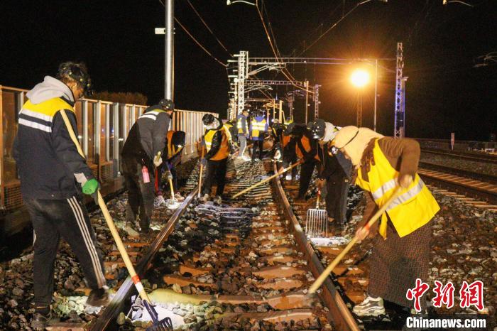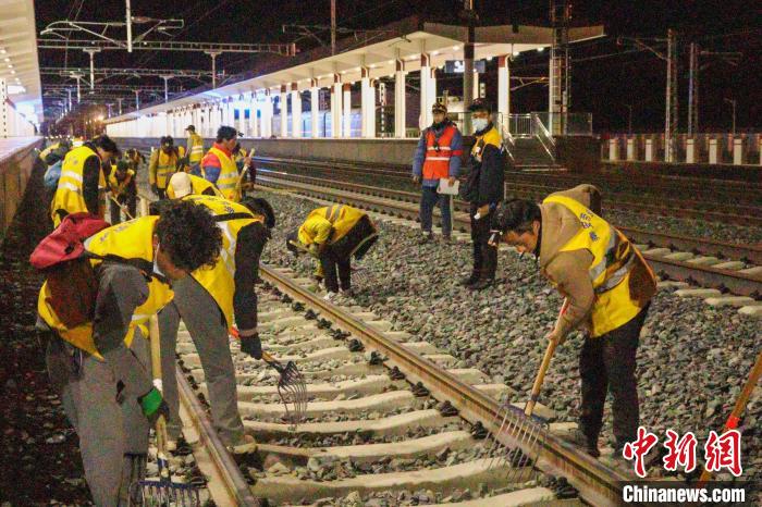 4月7日晚,施工人員在拉林鐵路進(jìn)行搗固作業(yè)。祁國(guó)慶 攝