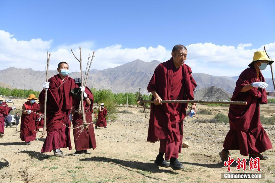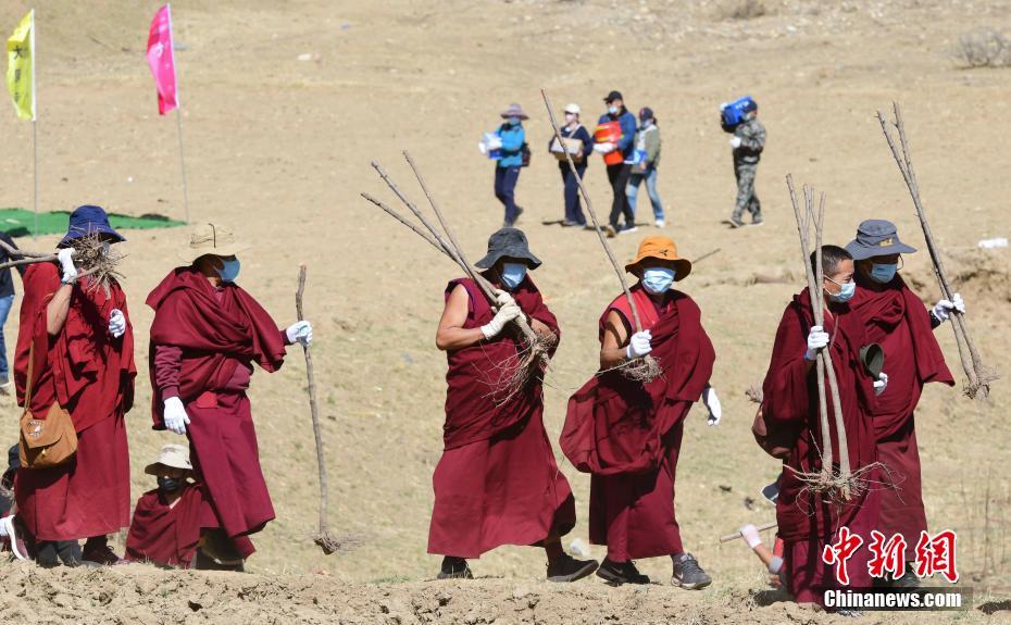 4月15日,西藏大昭寺僧人等在蔡公堂鄉(xiāng)植樹。當(dāng)日,西藏大昭寺在拉薩市城關(guān)區(qū)蔡公堂鄉(xiāng)啟動(dòng)拉薩南北山2800余畝山地綠化工程項(xiàng)目。 中新社記者 貢嘎來松 攝