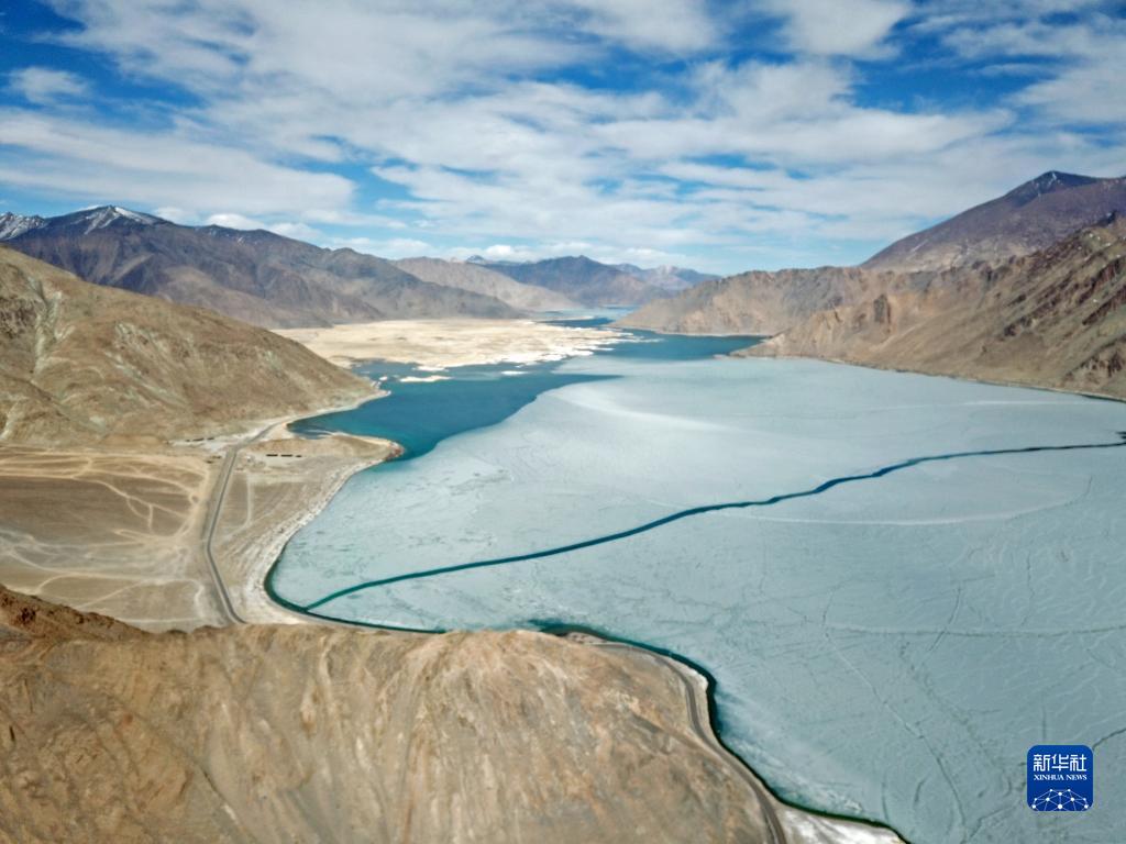 這是位于西藏自治區(qū)阿里地區(qū)改則縣的物瑪錯(cuò),湖水呈現(xiàn)出不同顏色(2022年4月12日攝)。新華社記者 姜帆 攝
