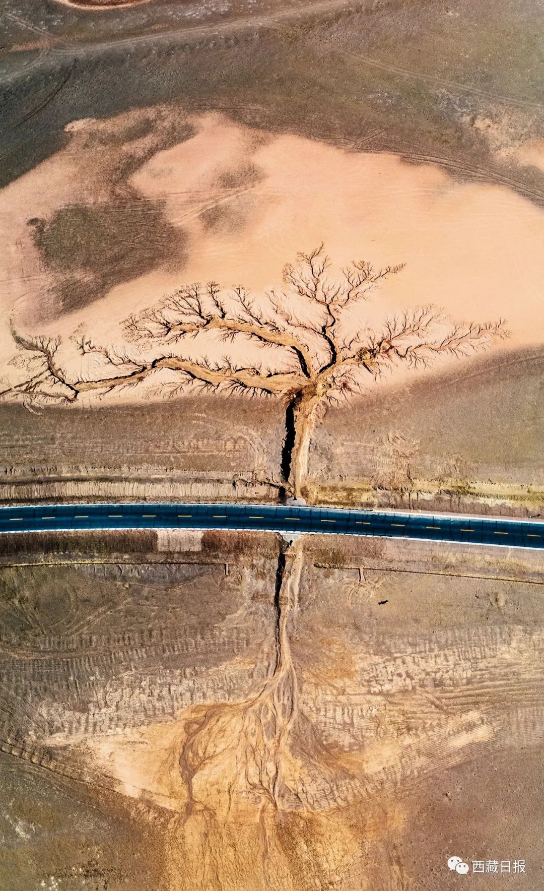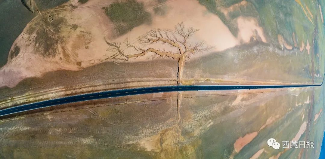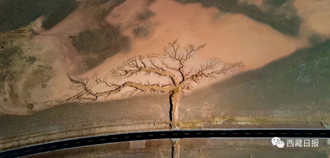 位置:“大地之樹”位于達(dá)則措南,距離尼瑪縣城30公里處,國(guó)道317 (2442)里程石墩旁邊。這棵大地之樹的樹干在國(guó)道南側(cè),樹根在國(guó)道北側(cè)。