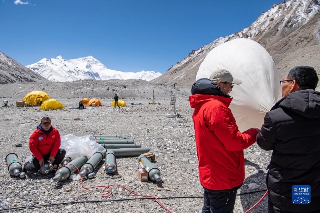 在珠峰登山大本營(yíng),科研人員施放大氣臭氧探空氣球(5月3日攝)。新華社記者 孫非 攝