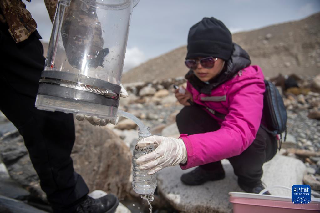 在東絨布冰川區(qū)域,科研人員正在進行微生物指標水樣采集(4月30日攝)。新華社記者 旦增尼瑪曲珠 攝