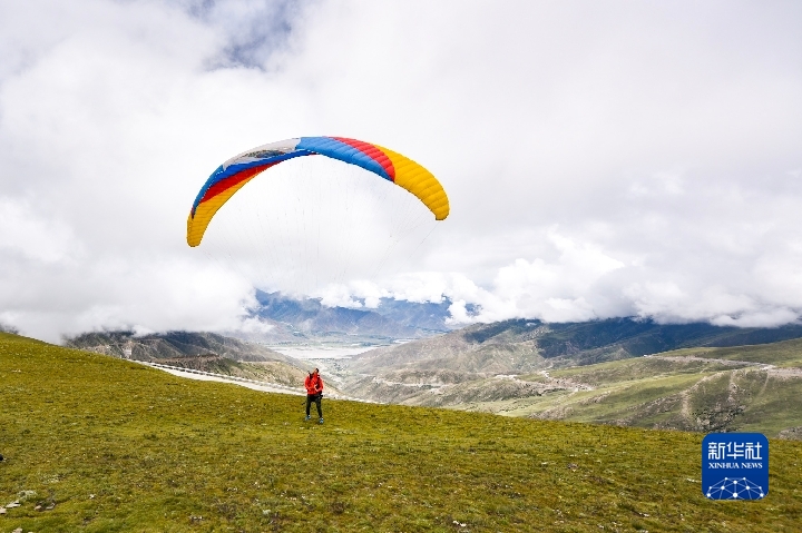 德慶歐珠在西藏練習(xí)滑翔傘運(yùn)動(dòng)。