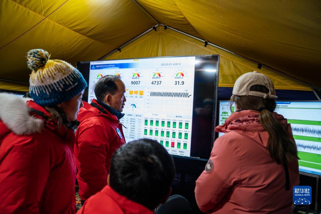 中科院院士、第二次青藏高原綜合科學(xué)考察研究隊隊長姚檀棟(左二)查看觀測儀器數(shù)據(jù)(5月15日 攝)。新華社記者 孫非 攝