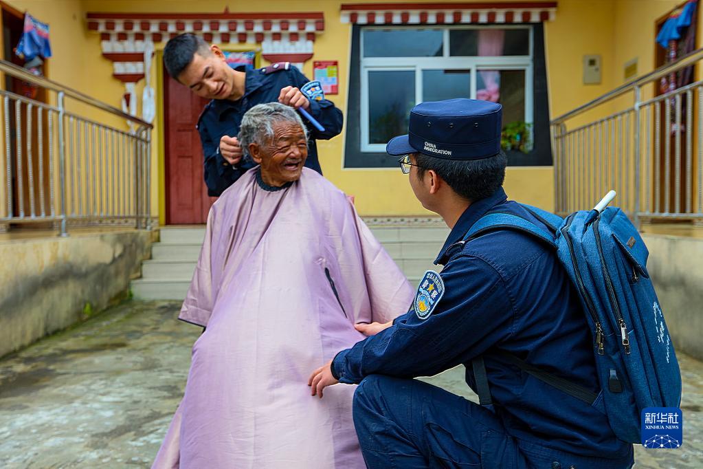 “阿嗚(察隅縣方言、老者的尊稱(chēng)),扎扎(理發(fā))!”定期走訪(fǎng)中,“背包民警”除了給竹巴村孤寡老人多多送生活必需品,還為他理發(fā)?!袄先硕洳惶?,剪頭發(fā)時(shí)經(jīng)常動(dòng)來(lái)動(dòng)去,我們就耐心陪老人聊天,現(xiàn)在越來(lái)越熟了還經(jīng)常聊家常?!泵窬娋S說(shuō)。