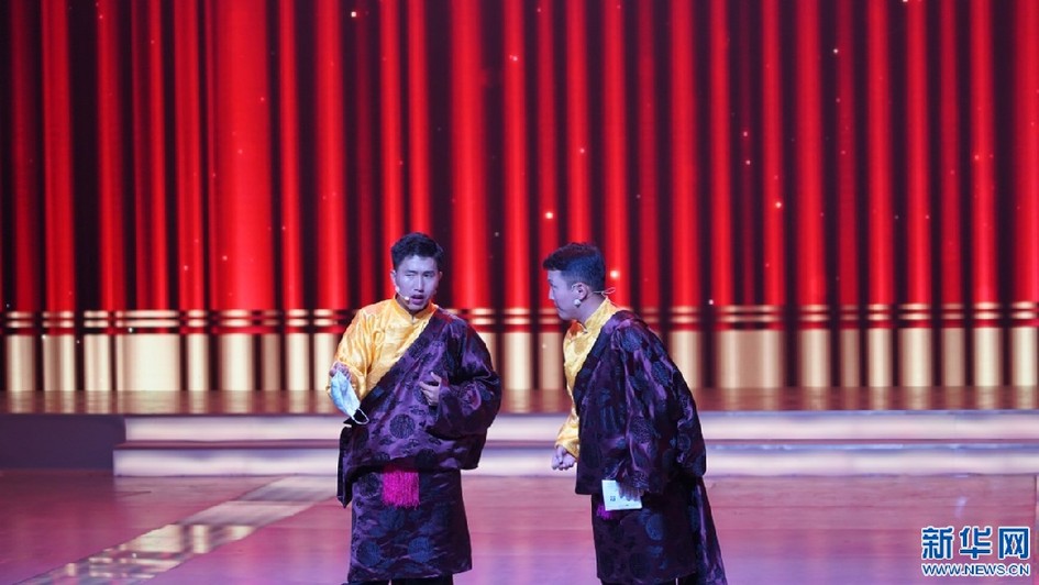 圖為晚會現(xiàn)場相聲表演《防疫從我做起》(5月31日攝)。新華網(wǎng)發(fā) 貢桑央吉(實(shí)習(xí)生)攝
