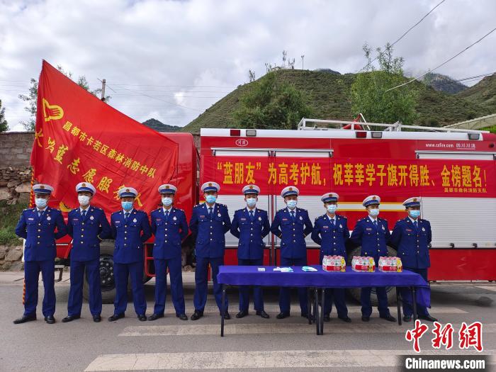 圖為消防指戰(zhàn)員為考生設立志愿服務點。卡若區(qū)森林消防中隊 攝