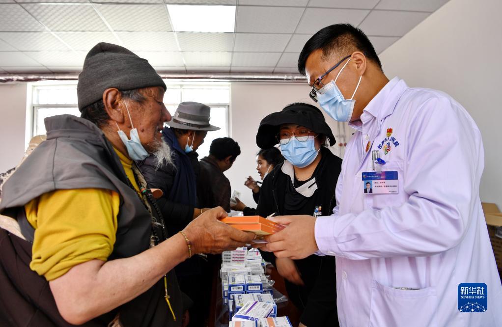 6月9日,北京市第七批“組團式”援藏醫(yī)療隊隊長、拉薩市人民醫(yī)院院長孫樹學(右)為居民發(fā)放藥品。新華社記者 張汝鋒 攝