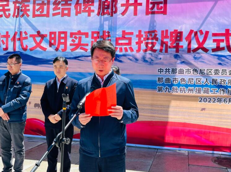 為鑄牢中華民族共同體意識(shí),助力色尼區(qū)新時(shí)代文明實(shí)踐和創(chuàng)建全國(guó)民族團(tuán)結(jié)進(jìn)步模范區(qū)創(chuàng)建工作,6月11日,由杭州援藏工作組組織修建完成的西藏首個(gè)民族團(tuán)結(jié)碑廊在西藏自治區(qū)那曲市色尼區(qū)正式開(kāi)園。那曲市政府黨組成員、副市長(zhǎng),色尼區(qū)委書(shū)記李東出席儀式,色尼區(qū)有關(guān)單位民族團(tuán)結(jié)創(chuàng)建工作專(zhuān)干、新時(shí)代文明實(shí)踐中心志愿者以及僧尼群眾代表60余人參加儀式。