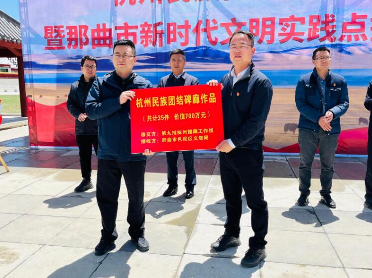 儀式上,那曲市委宣傳部決定將杭州民族團(tuán)結(jié)碑廊設(shè)為那曲市新時(shí)代文明實(shí)踐點(diǎn),并進(jìn)行授牌。杭州援藏工作組向色尼區(qū)捐贈(zèng)價(jià)值700萬(wàn)元的杭州民族團(tuán)結(jié)碑廊書(shū)法作品。