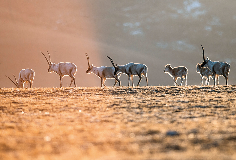 4月的傍晚,金色的霞光灑落在綿延的草原上。遠(yuǎn)處成群的藏羚羊、藏野驢時(shí)而低頭進(jìn)食,時(shí)而邁步奔跑。
