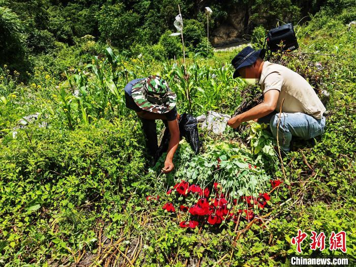 圖為民警鏟除野生罌粟現(xiàn)場(chǎng)?!∪湛t市公安局禁毒支隊(duì)供圖