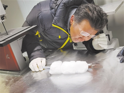 中國(guó)科學(xué)院青藏高原研究所研究員徐柏青在拉薩冰芯庫(kù)測(cè)量分析樣品受訪(fǎng)者供圖