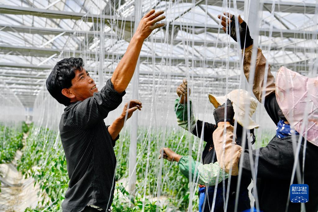 戴著遮陽帽,一邊修剪辣椒枝條,一邊系繩吊枝,兩三人搭檔,有說有笑。這是記者在西藏山南市瓊結(jié)縣千畝蔬菜基地看到的場(chǎng)景。