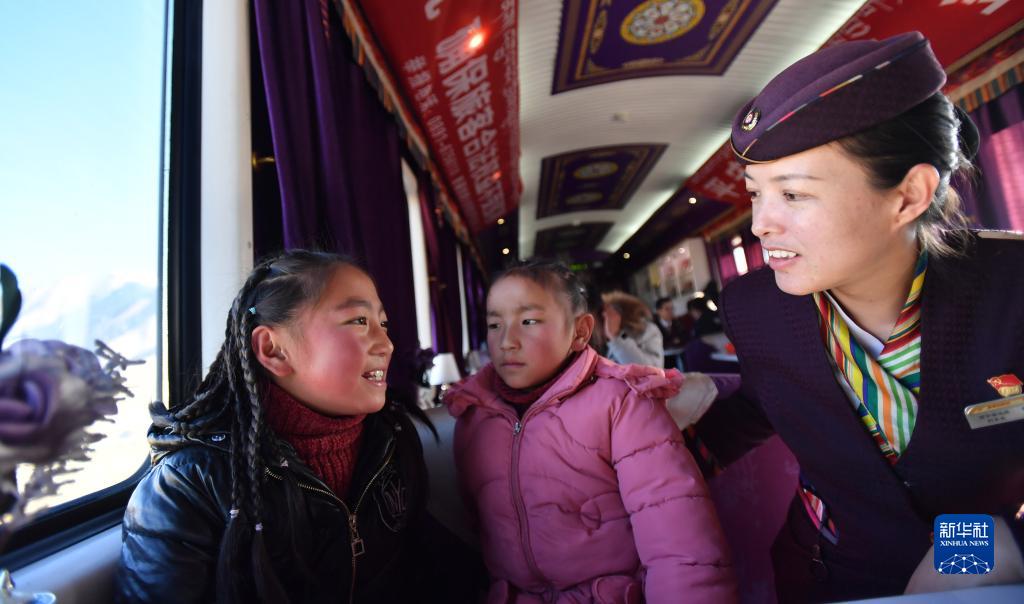 青藏鐵路拉薩至日喀則段的藏族女列車長貢久曲珍(右)與乘客聊天(2020年1月12日攝)。新華社記者 覺果 攝