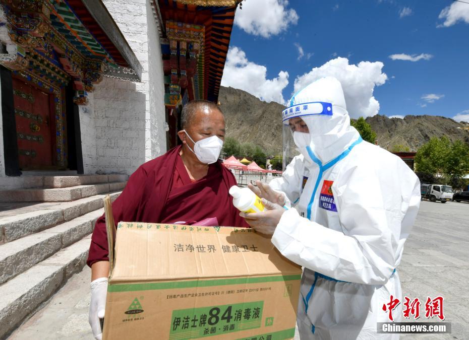 8月14日,西藏拉薩,志愿者為哲蚌寺送來防疫物資,并為僧人講解消毒液使用方法。當(dāng)日,拉薩市應(yīng)對新冠肺炎疫情工作領(lǐng)導(dǎo)小組決定,至8月15日凌晨3時的拉薩主城區(qū)消殺管理時間,再延長三天至8月18日凌晨3時,在拉薩主城區(qū)以社區(qū)網(wǎng)格為基本單位,快速精準(zhǔn)開展多輪全員核酸篩查。 中新社記者 李林 攝