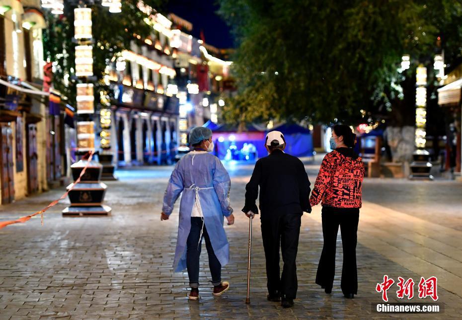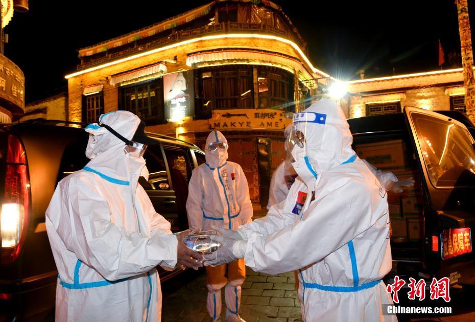 8月14日,西藏拉薩,志愿者在八廓街內(nèi)為防疫人員送去抗疫物資。當(dāng)日,拉薩市應(yīng)對新冠肺炎疫情工作領(lǐng)導(dǎo)小組決定,至8月15日凌晨3時的拉薩主城區(qū)消殺管理時間,再延長三天至8月18日凌晨3時,在拉薩主城區(qū)以社區(qū)網(wǎng)格為基本單位,快速精準(zhǔn)開展多輪全員核酸篩查。 中新社記者 李林 攝