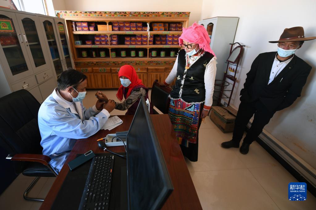 在治多縣索加鄉(xiāng)衛(wèi)生院,布久索南更青為患者把脈(8月11日攝)。新華社記者 范培珅 攝
