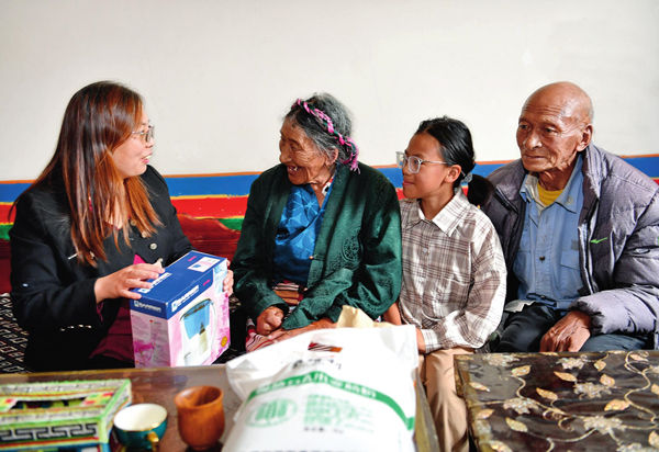 王玉秀(左一)來到拉薩市達(dá)孜區(qū)德慶鎮(zhèn)次旦老人家走訪并送上慰問品(2022 年 7月 27 日攝) 張汝鋒攝
