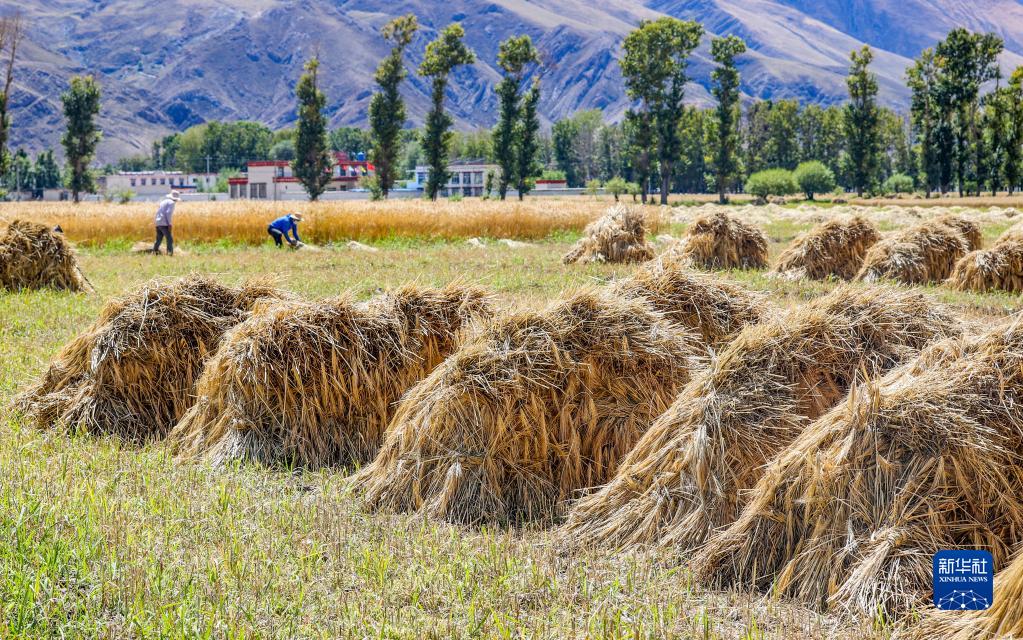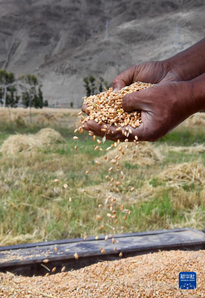 林周縣邊林鄉(xiāng)當杰村玉沖組的村民在檢查收獲的小麥(9月6日攝)。新華社記者 覺果 攝