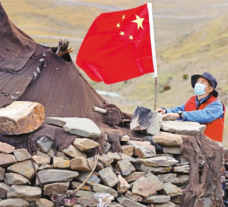 圖為山南市瓊結(jié)縣加麻鄉(xiāng)特日村駐村工作隊(duì)幫助牧民更換國(guó)旗。 通訊員 倫珠澤仁 記者 次旺 攝