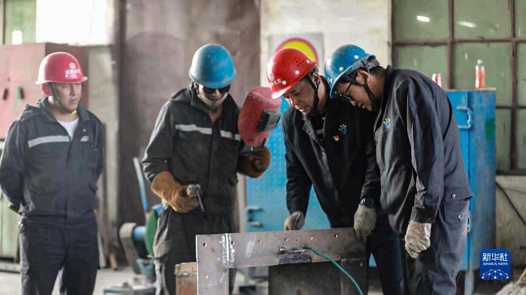 旦增頓珠(右二)和工友在維修設(shè)備(2022年7月13日攝)。新華社發(fā)