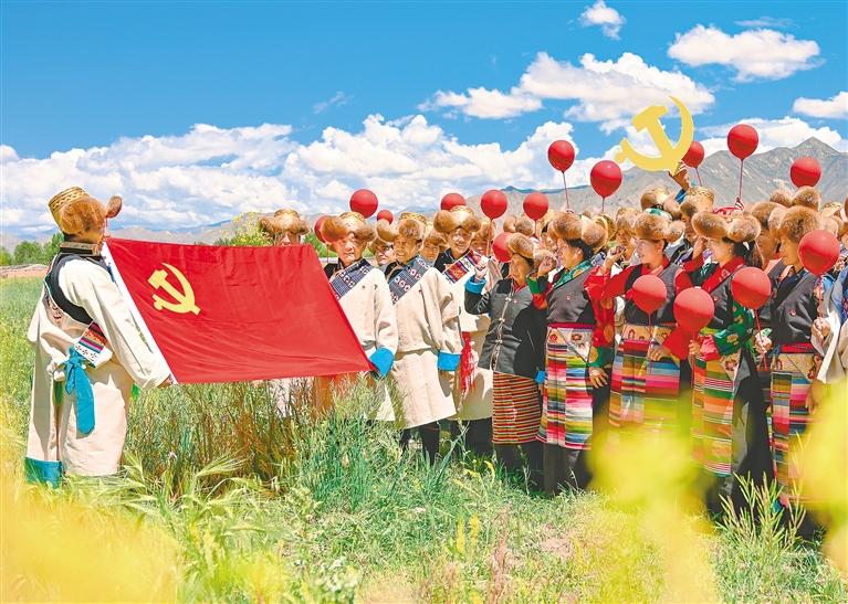 圖為黨的光輝照邊疆、邊疆人民心向黨。各族群眾以淳樸而熱烈的形式表達(dá)自己的愛黨愛國(guó)情感。圖為2021年7月1日,西藏自治區(qū)貢嘎縣黨員開展慶祝中國(guó)共產(chǎn)黨成立100周年“永遠(yuǎn)跟黨走”主題黨日活動(dòng)。