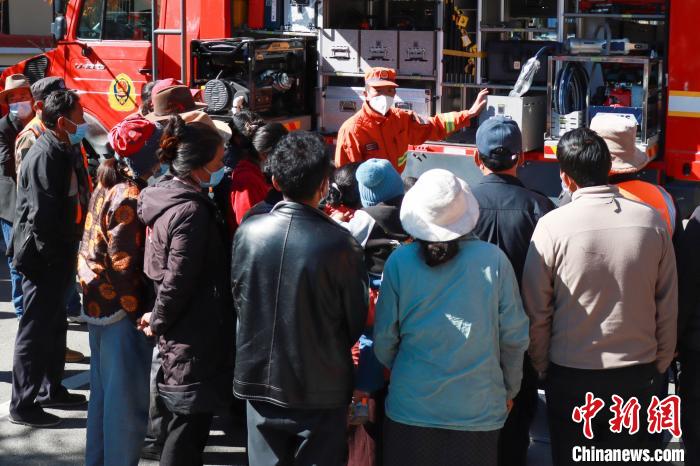 活動(dòng)現(xiàn)場(chǎng),消防員向民眾講解裝備操作。 袁勇彬 攝