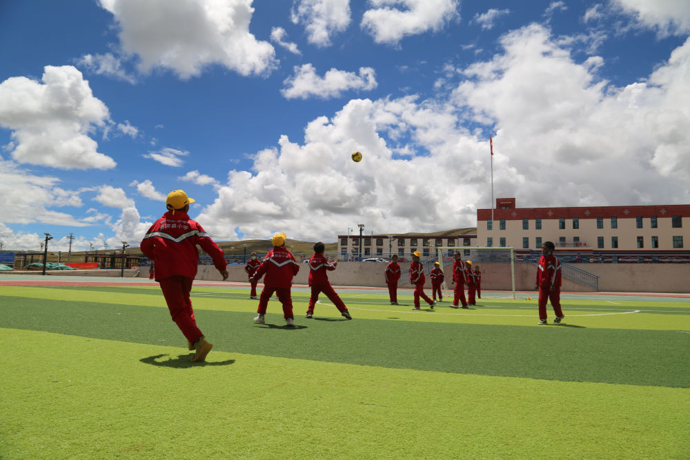 西藏那曲市聶榮縣小學(xué)的學(xué)生們在踢足球(4月20日攝)。新華社發(fā)(大巴次 攝)