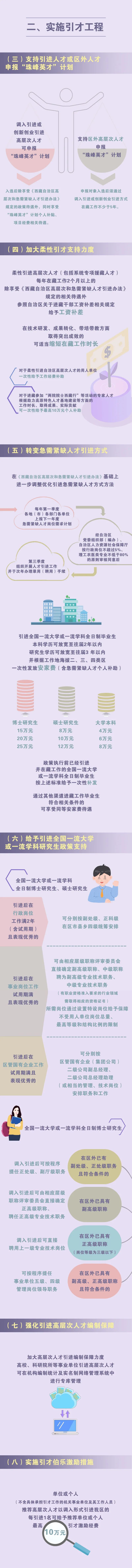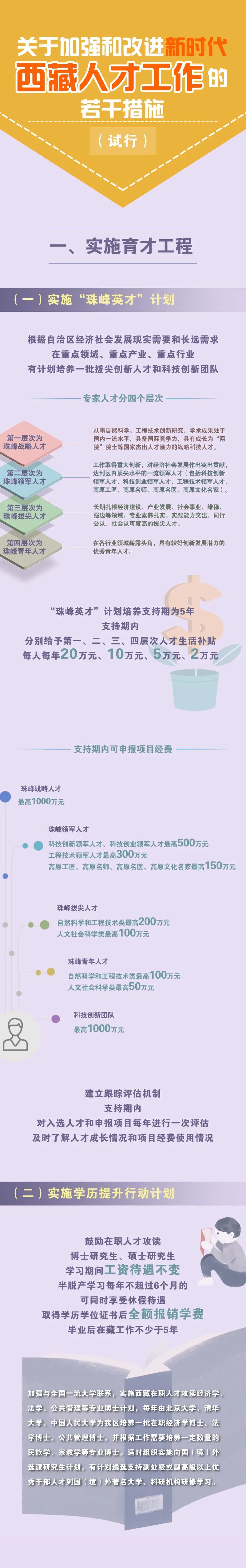 實(shí)施“珠峰英才”計(jì)劃,每年遴選支持一批珠峰戰(zhàn)略人才、珠峰領(lǐng)軍人才、珠峰拔尖人才、珠峰青年人才和科技創(chuàng)新團(tuán)隊(duì),在5年支持期內(nèi)給予生活補(bǔ)貼和項(xiàng)目經(jīng)費(fèi)支持,項(xiàng)目經(jīng)費(fèi)最高可申請1000萬元。實(shí)施學(xué)歷提升行動(dòng),支持在職人才攻讀研究生,并協(xié)調(diào)全國頂尖高校為西藏定向培養(yǎng)博士研究生。